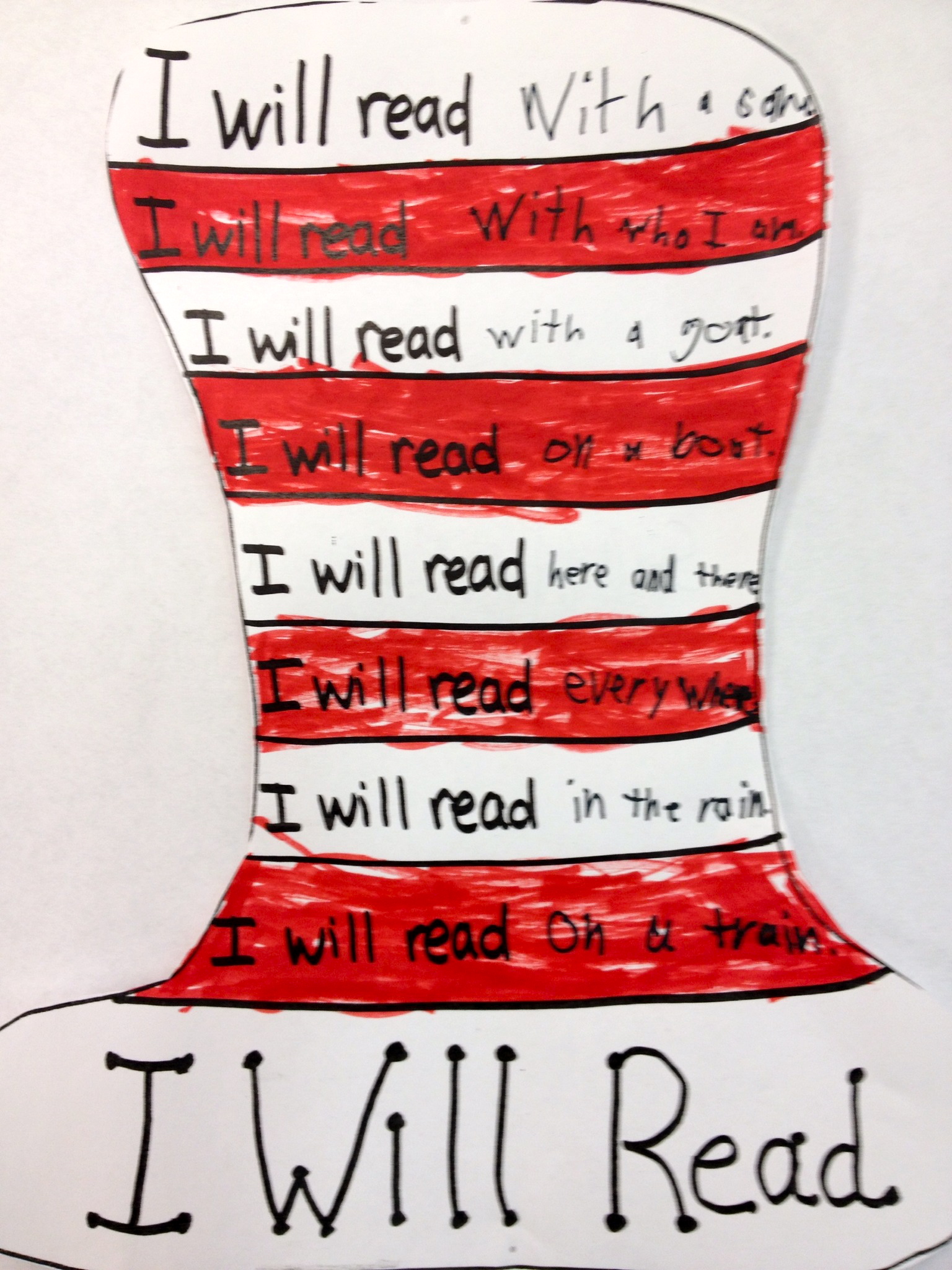 Using red markers, students then colored every other hat section in red. They used black markers to complete the I will read sentences by either using one of the rhyming pairs we had brainstormed or creating their own pairs.